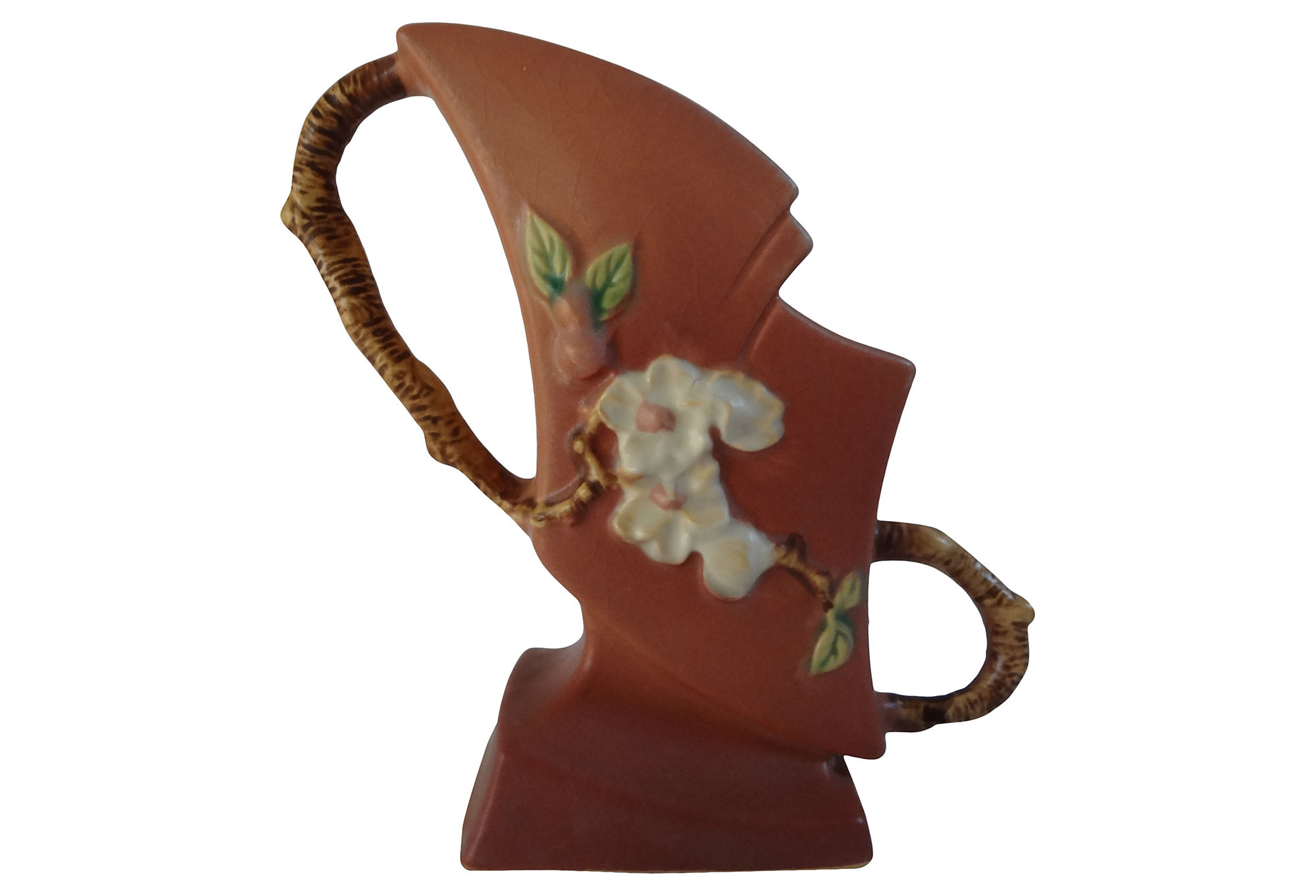 Roseville Pottery, c. 1948, "Apple Blossom", Double Handled 7" Vase in Terra Cotta, Offered at an Opening Bid of $64.99. Includes Free Shipping.