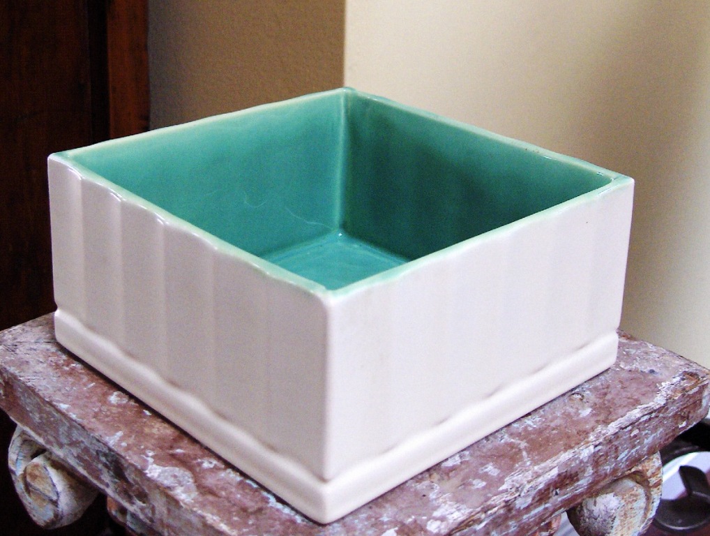 Catalina Pottery by Gladding McBean, c. 1937-43 6″ Square x 3″ High Flower Bowl w/ Fluted Sides- Cream & Turquoise, $58.00 SOLD