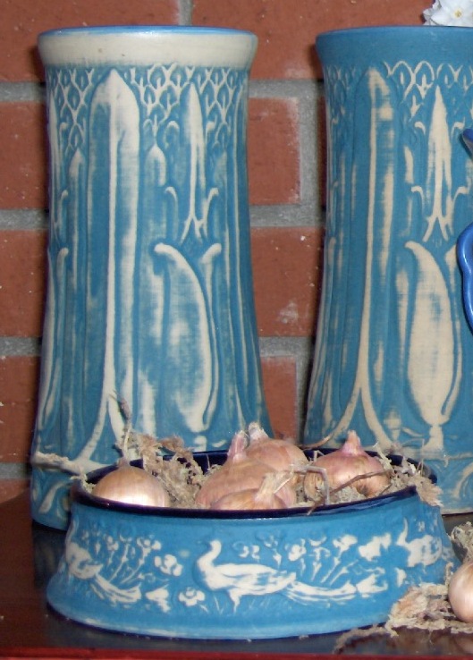 In conjunction with its strong color story what originally attracted us to Monmouth was its very unusual brushed ware works created in the early 1900’s and used to perfection in it’s Dull Finish line that was documented in a 1927 catalog.  Jardinieres, vases and bulb forcing bowls from three series “Fern”, “Lotus” and “Egyptian” are favorites not only with us but with collectors worldwide. Examples from these series will be available at the Long Beach and Del Mar shows this month.