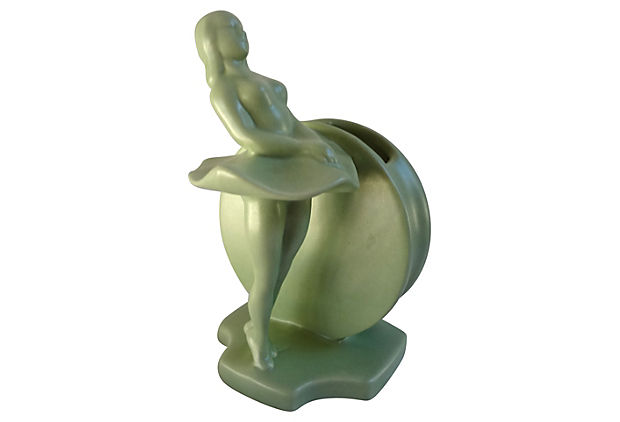 Noteworthy designers have worked for Haeger, including Royal Hickman (1938). One of Haeger’s  art pottery divisions, Royal Haeger, carries his first name.  Royal was known for his ability to capture the spirit of the Art Deco movement into his designs. This 1940s figural work is most likely a Royal Hickman design although I have been unable to find credit given to him or any other designer.  It features a ballerina dressed in a tutu next to a disc-shaped vase. The vase not only draws from Art Deco design but a strong Edgar Degas influence should be noted as well. Although unmarked, it is well documented in Haeger reference books.  This example, offered in a soft sage green stands about 8″ tall and is in superb condition.