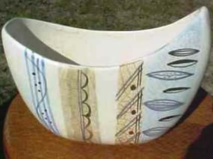 Sascha Brastoff - c.1953-62, 5.5" x 7" "Abstract" Series Crescent Shaped Vase, Stamped w/Rooster Logo, Mold #F21, $85.00
