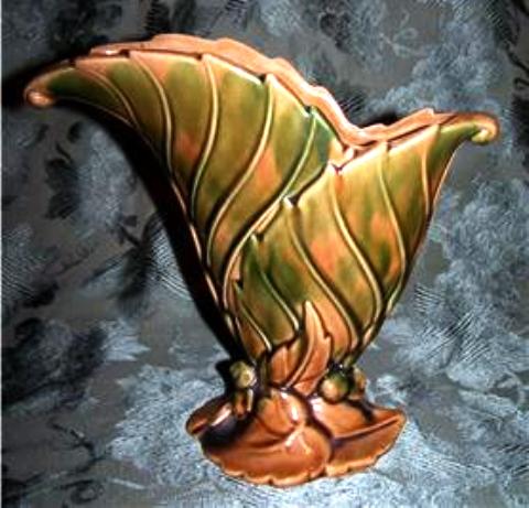 Royal Haeger Pottery c.1949 8.5" Green & Brown Agate Double Leaf Fan Vase with Original Label by Royal Hickman, Mold # R301, $68.00