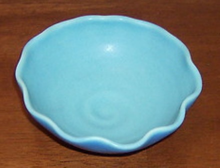 Van Briggle Pottery, c.1946-48 5.5″ x 2.25″ Original Hand Thrown & Hand Pinched Ruffled Bowl by Clem Hull in Ming Turquoise Glaze, $140.00 SOLD