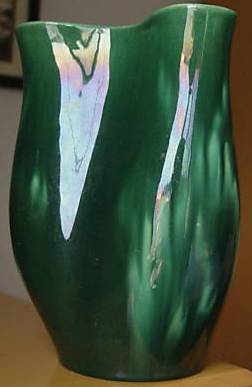 Royal Haeger Pottery, c. 1946-55 9″ Pinched Rim Green Irridescent Vase – Mold #R1946, $70.00