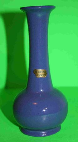 Circa 1930-35, 6.5″ blue glazed bud vase with original label, $49.00
