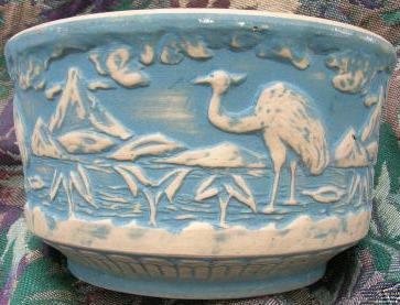 Circa 1925-30, 5″ x 7″ diameter blue dull finish Japanese bird & mountain jardiniere, $125.00, SOLD
