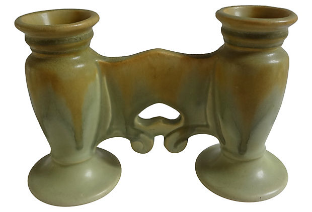 Roseville Pottery, c. 1915-27, “Carnelian I,” 8″(L) x 5.25″(H) Gate Vase – Candleholder, $275.00