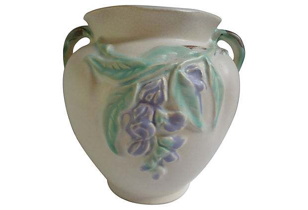 c.1935-39 “Floral” 6″ Embossed Wisteria Vase w/Twig handles & Scalloped Rim, Mold #F-21, $139.00